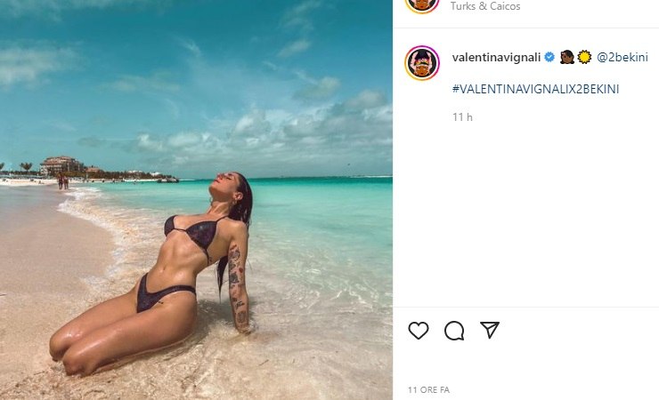 Come al solito Valentina Vignali sfoggia un corpo statuario che ha steso praticamente tutti. Sopra il bikini mette in risalto il ‘davanzale’ da urlo, lo slip invece è sgambatissimo. Quest’ultimo rischia di mostrare fin troppo, si intravede anche un tatuaggio sull’inguine. Con la sua bellezza mozzafiato e la sua sensualità da vendere ha conquistato tutti, i fan la venerano.