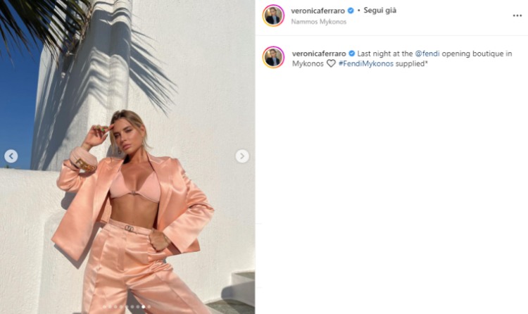 Dopo un salto a Torino però, per la Ferraro è il momento di riprendere le valigie e lasciare l’Italia. In queste ultime ore, come ci fa sapere proprio tramite la sua pagina social, Veronica si trova nella splendida location di Mykonos. Il motivo è ovviamente legato alla moda.
