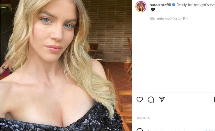 Dalla foto si intravede un top o vestitino nero di paillettes, la scollatura è generosa e mette in risalto il suo esplosivo décolleté. Con la sua assurda sensualità e la sua incredibile bellezza Sara Croce anche questa volta ha infiammato il web, è bella da togliere il fiato.