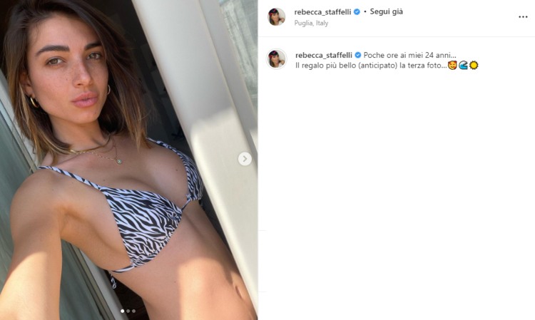 Rebecca si è ritratta in un selfie senza trucco, mentre indossa un bikini zebrato. Il triangolino copre il decolleté che comunque risalta in primo piano sull’obiettivo catturando l’attenzione. La Staffelli sfoggia un fisico perfetto e scolpito da far invidia, anche nel secondo scatto in cui si ritrae a figura intera nello specchio. “Poche ore ai miei 24 anni… Il regalo più bello (anticipato) la terza foto“, scrive nella didascalia.