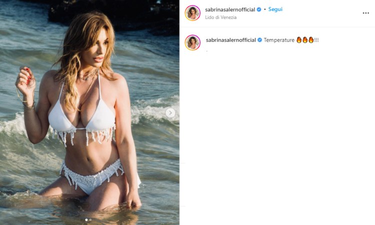 Tenetevi forte perché le foto pubblicate nelle ultime ore da Sabrina Salerno potrebbero davvero far aumentare la temperatura. La cantante oggi ha deciso di mostrarsi in versione totalmente estiva, inginocchiata in spiaggia tra le onde del Lido di Venezia. Più bella ed esplosiva che mai, indossa un costumino bianco composto da triangoli e slip con frange.