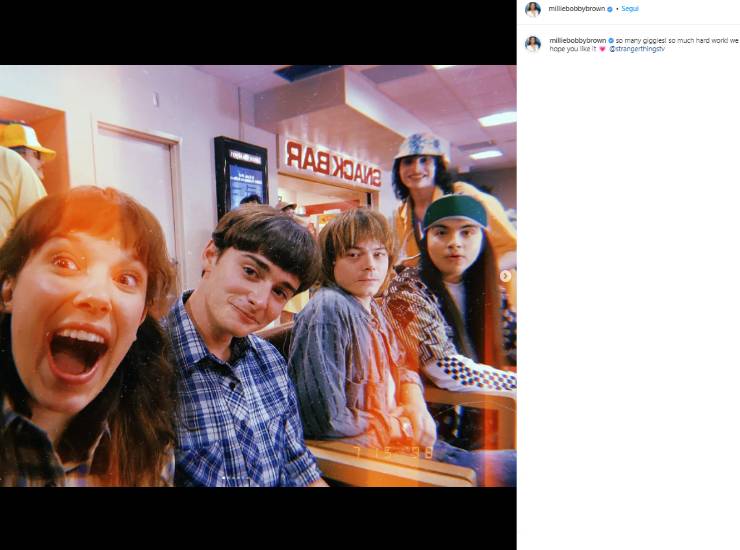 In occasione dell’uscita della quarta stagione di Stranger Things però Millie Bobby Brown ha voluto dedicare ai fans una speciale slideshow con i momenti migliori del dietro le quinte della serie. “Così tante risate! Così tanto lavoro! Speriamo vi piaccia” ha scritto l’attrice. L’interprete di Undici ha condiviso le immagini del backstage che la ritraggono insieme ai colleghi di cast in alcuni attimi rubati tra un ciak e l’altro. Dai pranzi insieme alle risate..un vero manifesto di quello che avviene dietro alle telecamere. Dalle immagini si può vedere come senza alcun dubbio buona parte del successo della serie si anche dovuto al clima di grande armonia e chimica che si respira all’interno del cast dei “bambini” (ormai ex tali) della serie. Una squadra davvero vincente. Il post ha davvero fatto impazzire i fans. “Siamo fieri di te” “Sto guardando ora la serie. E’ valsa la pena aspettare” scrivono.