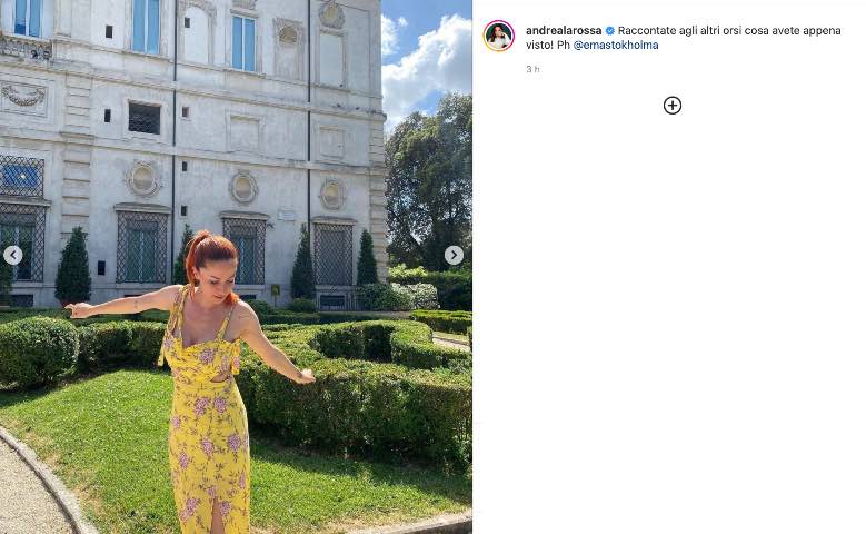 Andrea Delogu in versione assolutamente estiva. La showgirl infatti, nella mattinata di oggi, ha deciso di dare il buongiorno ai suoi fan con un post in mezzo al verde, con un outfit a tema, in tutta la sua bellezza e trasmettendo la solita positività. Lo ha fatto mostrandosi in ben 10 scatti, tutti nella medesima location, sfoggiando un vestitino giallo con gonna lunga, scollato, a tema floreale. In mezzo al prato, poi tra gli alberi tra la natura, la conduttrice si mette in posa, mostrandosi prima in un primo piano in un selfie, poi appoggiata alla ringhiera, di spalle.