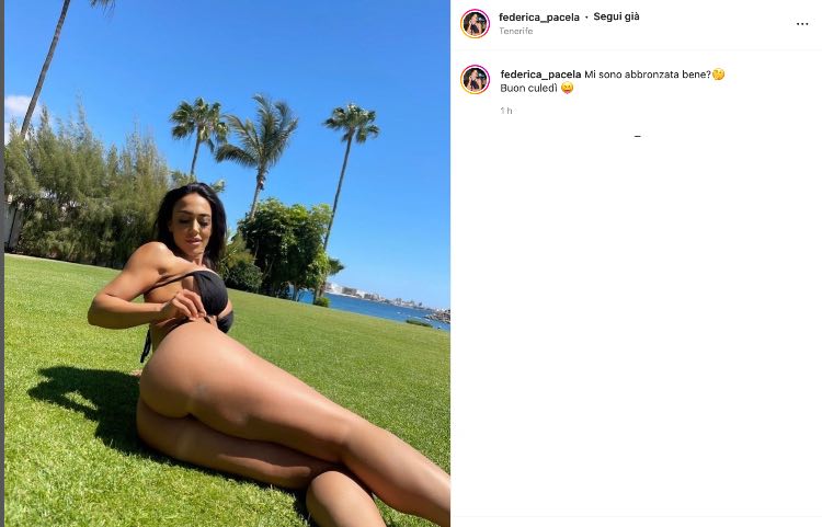Il famoso “culedì” della Pacela dunque, molto attiva sui social e sempre intenta a generare interazioni e affiatamento con la sua community, è arrivato puntuale anche oggi. In quel di Tenerife, la modella si mette in mostra su un prato distesa, con indosso un bikini nero da togliere il fiato. Ovviamente, come da tradizione, è il lato b il protagonista dello scatto, mentre la modella stuzzica in didascalia: “Mi sono abbronzata bene? Buon culedì!”.