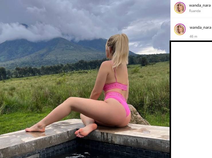 Wanda è invece seduta su quello che sembra il bordo di una piscina e dà le spalle alla camera. Indossa un completo intimo rosa di un noto marchio e lo spettacolo è davvero pazzesco. Un toppino davvero mini, con bretelline sottilissime ed uno slip che non copre abbastanza, lasciando in bella mostra il suo fondoschiena perfetto. I lunghi e biondi capelli raccolti in una coda per una sensualità che lascia davvero senza parole.
