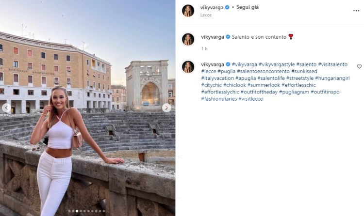Ed eccola qui, questa volta dopo aver lasciato il Lago di Como è partita in direzione Salento. Fungendo anche da splendida promoter turistica, Viky Varga ha condiviso nelle ultime ore un album che racchiude favolosi scatti, uno più bello dell’altro nella città barocca di Lecce. Con lo sfondo dell’Anfiteatro Romano di Piazza Sant’Oronzo e la pietra leccese del centro storico, la modella risplende ancora di più di luce propria.
