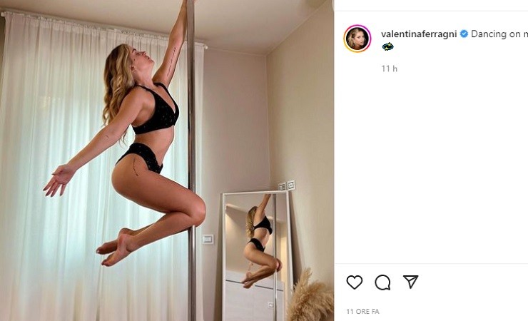 Di profilo sul palo da pole dance Valentina Ferragni allarga un braccio mentre con l’altro si tiene, si tiene anche con le gambe e chiude gli occhi, come sempre è magnifica. Il suo corpo pazzesco ha ipnotizzato subito tutti coloro che con grande affetto la seguono, questi non riuscivano più a toglierle gli occhi di dosso.