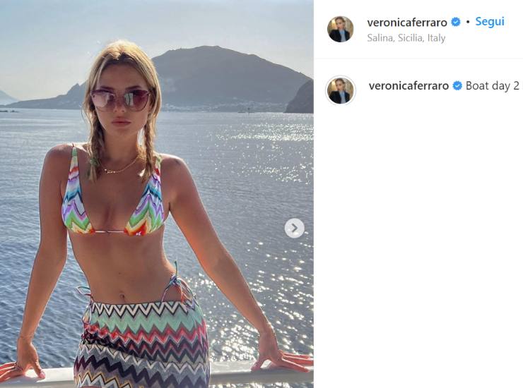 Nell’ultimo post pubblicato sulla sua pagina Veronica ha mostrato ai fans uno degli outfit scelti per il giorno di navigazione. L’influencer ha scelto un bikini molto colorato, con fantasia a triangoli. E un mini – pareo a completare perfettamente il look. L’influencer ha mostrato una forma fisica davvero perfetta. “Giorno in barca numero 2” ha scritto la Ferraro.