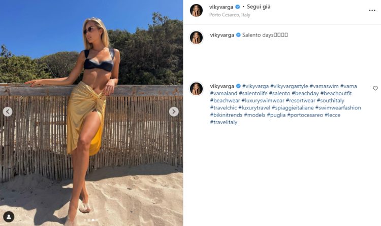 La Varga ha infatti fondato un marchio a tema balneare chiamato VamaSwim, che racchiude una collezione di capi molto eleganti e raffinati tutti relativi appunto al beachwear. Lei non può che esserne la testimonial migliore, considerando che il fisico e la sua bellezza smisurata glielo permettono assolutamente. Viky però, tra gli impegni di lavoro trova spazio anche per un po’ di relax, specialmente adesso che l’estate è praticamente iniziata.