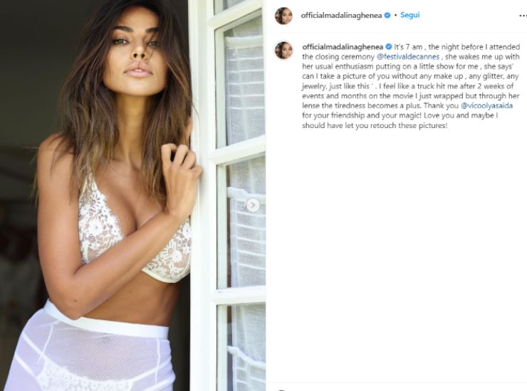 “Sono le 7 del mattino , la sera prima che partecipassi alla cerimonia di chiusura del Festival di Cannes” ha raccontato Madalina, rivelando la richiesta di una nota fotografa “Mi sveglia con il suo solito entusiasmo mettendo in scena un piccolo spettacolo per me , dice ‘posso farti una foto senza trucco , senza glitter, senza gioielli, proprio così’ . Mi sento come se un camion mi avesse investito dopo 2 settimane di eventi e mesi di film che ho appena finito di girare, ma attraverso le sue lenti la stanchezza diventa un vantaggio. Grazie per la tua amicizia e la tua magia! Ti voglio bene e forse avrei dovuto farti ritoccare queste immagini!” ha scritto.