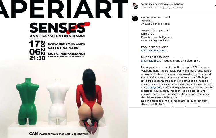 Regina del cinema “hard”, diva dei social, e adesso anche opera d’arte. Valentina Nappi continua la sua ascesa nel mondo dello spettacolo passando anche per l’arte. Si, perché nelle scorse ore il museo di arte contemporanea di Casoria ha deciso di regalare ai visitatori un’esperienza sensoriale unica nel suo genere, passando dai 5 sensi e ovviamente anche dall’olfatto. Una serie di video, poi musica e azioni artistiche coinvolgeranno il pubblico che potrà addirittura annusare. L’evento, come si legge nella locandina pubblicata dalla stessa Nappi, si terrà al CAM in data 17 giugno 2022, alle ore 21:30, con il titolo di “Aperiart Annusa Valentina Nappi“.