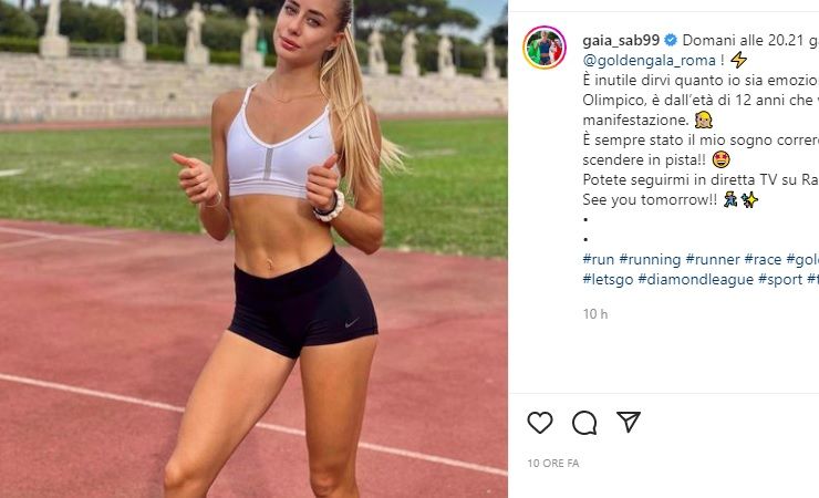 Nella didascalia del post pubblicato ieri sera sul suo profilo Instagram la splendida mezzofondista e influencer ha ricordato un importantissimo appuntamento a tutti coloro che la seguono e la amano. Di che si tratta? Oggi gareggerà a Roma al Golden Gala e sarà possibile vedere la manifestazione in diretta Tv su Rai 3. Ai suoi fan ha fatto sapere di essere davvero molto emozionata di correre allo Stadio Olimpico perché è sempre stato il suo sogno. Guarda questa manifestazione da quando aveva 12 anni e non vede l’ora di scendere in pista.