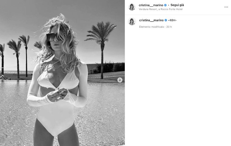 Lo shooting, tra foto e video, condiviso nella mattinata di oggi è in pieno stile Cristina Marino. Il suo tocco social è in effetti inconfondibile, e anche l’ultimo post è in piena linea con le precedenti pubblicazioni. Anche le più recenti, dove sempre dal mare si era immortalata insieme alla famiglia. Il post si apre dunque con un primo piano in bikini bianco, con alle spalle una splendida piscina e delle palme con il mare all’orizzonte sullo sfondo. La stessa piscina diventata famosa sia tramite profilo di Chiara Ferragni, che aveva deciso di trascorrere il compleanno nella stessa tenuta, che di Federica Pellegrini negli ultimi mesi.