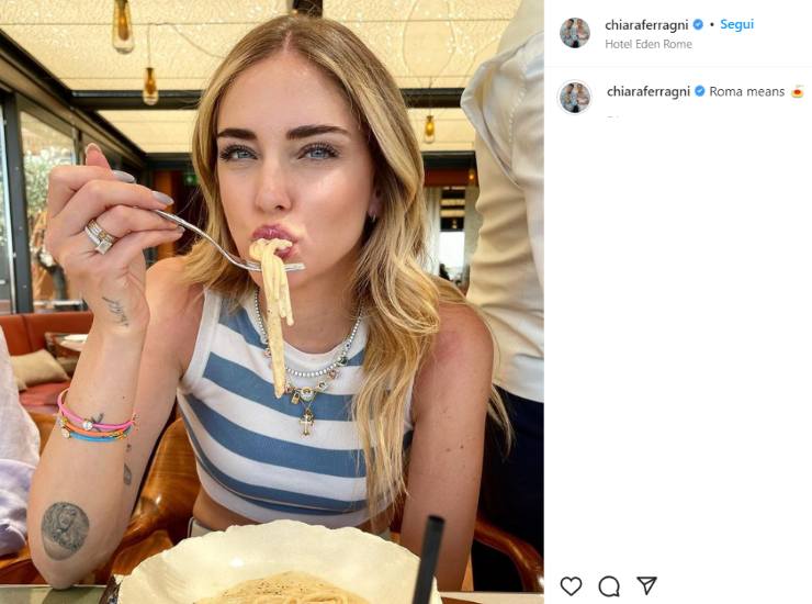 Tra i vari impegni nella capitale la Ferragni ha potuto dedicarsi anche un momento da turista e godere della splendida cucina e di alcuni piatti della tradizione romana. Chiara ha optato per un buonissimo piatto di calcio e pepe nel lussuoso ristorante dell’hotel Eden che l’ha ospitata nel soggiorno nella capitale. Nell’ultima immagine pubblicata sul suo profilo Instagram si vede l’influencer gustare soddisfatta il suo piatto di pasta. “Roma vuol dire pasta” ha scritto l’influencer.