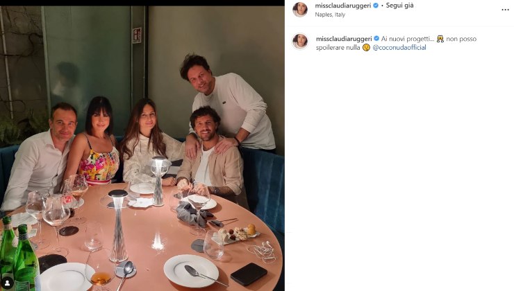 Nello scatto, la bellissima Ruggeri mostra di essere ad una cena di lavoro, mentre indossa un coloratissimo abito floreale. Tra i volti noti compare anche il giornalista Gabriele Parpiglia, mentre la modella tagga il brand Coconuda. In effetti, già negli ultimi mesi l’abbiamo vista spesso collaborare con il noto marchio di moda, presenziando addirittura come indossatrice a qualche sfilata. Che sia dunque l’inizio di un nuovo bellissimo lavoro per lei? “Ai nuovi progetti… non posso spoilerare nulla!“, scrive nella didascalia la Miss.