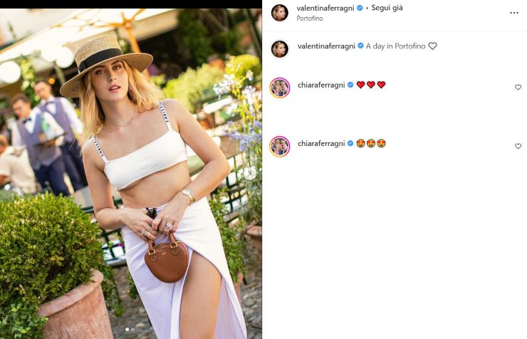 Mentre la sorella Chiara diventa sempre più bollente e si lancia in topless da urlo che stanno facendo parlare i media, si può dire che anche Valentina Ferragni ogni tanto si conceda un po’ di pepe. Questa volta l’influencer si trova di nuovo in quel di Portofino per una prosecuzione delle sue vacanze dopo gli impegni modaioli. Nel suo ultimo post vediamo un paio di scatti in cui mostra il suo outfit total white.