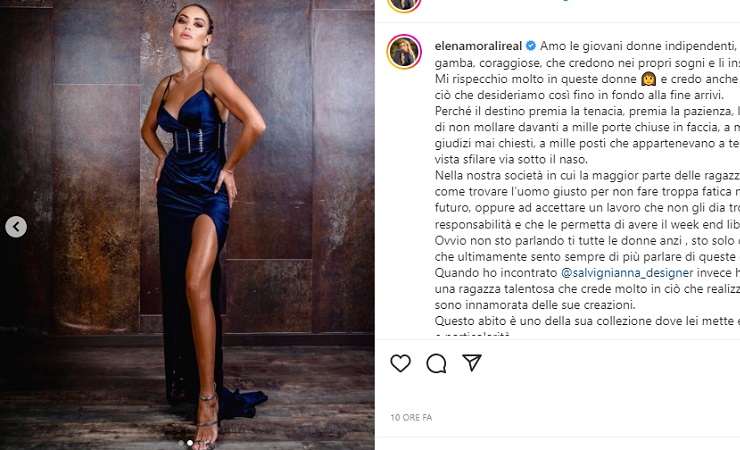 Elena Morali ha aggiunto una lunga didascalia nel post pubblicato ieri sera su Instagram. Tra le varie cose ai suoi tantissimi fan ha rivelato che ama le giovani e indipendenti donne, coraggiose e in gamba, che credono nei loro sogni e li inseguono. Le si rispecchia molto in quelle donne, pensa che se si desidera una cosa fino in fondo alla fine arriva. A parer suo il destino premia la pazienza, la tenacia, la volontà di non mollare davanti a tutte le porte chiuse in faccia e altro ancora.