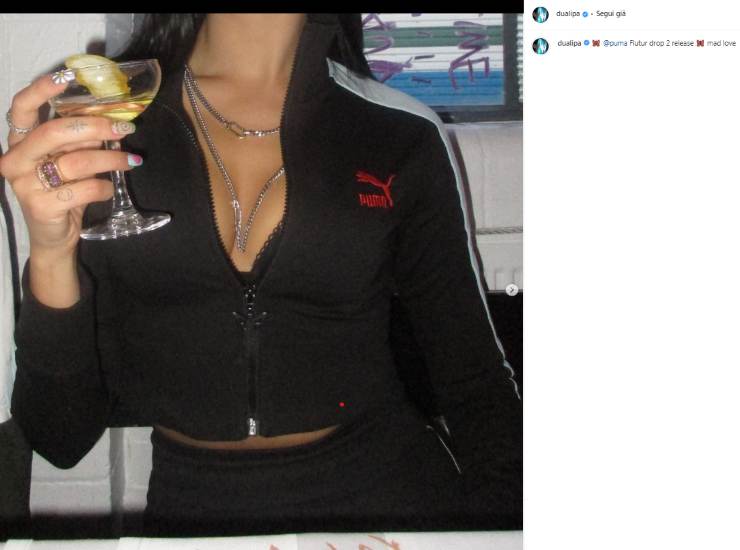 Dua Lipa presenta sui social la collezione frutto della collaborazione con Puma: scollatura vertiginosa e sensualità. I fans impazziscono