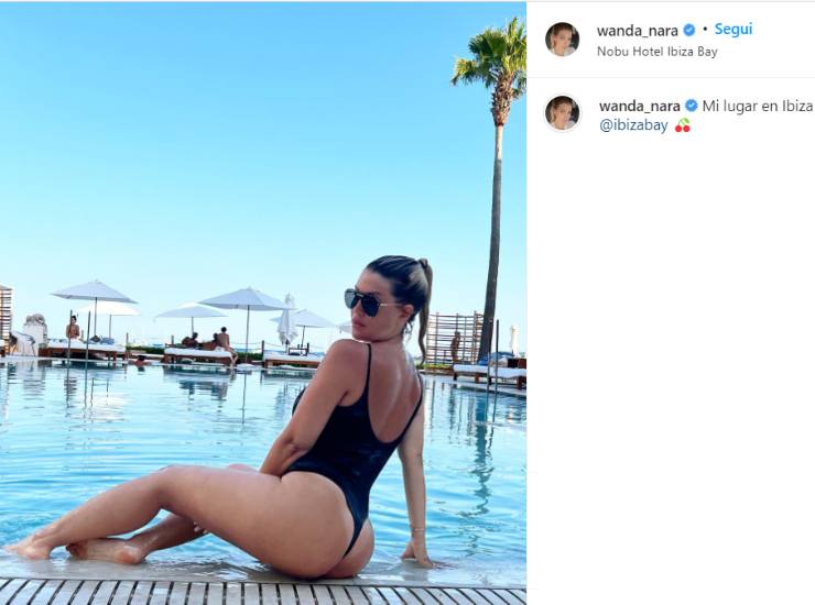 La Nara si sta godendo la “movida” di Ibiza, e sui social sono comparse le immagini della manager davvero scatenata in discoteca. Di giorni invece, tutto è dedicato al riposo, tra male e piscina. Nell’ultimo post pubblicato sulla sua pagina Wanda ha pubblicato un’immagine che la ritrae a bordo piscina. La Nara, di spalle, è sdraiata di schiena sul bordo della piscina e in modo sensuale guarda la camera.