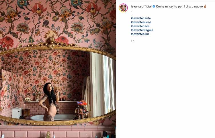 Nello scatto, molto artistico, la donna si mostra in un bagno dalle pareti rosa con composizioni floreali assolutamente chic e anche vintage. Allo specchio Levante si inquadra in topless, con la pancia in bella mostra, una mano dietro la schiena e i lunghi capelli neri sopra il petto, in una posa veramente suggestiva. Uno scatto che ha inoltre fatto venire qualche dubbio ai fan. Molti sono infatti intervenuti nei commenti, chiedendo alla cantante se ci fosse qualche novità in vista, convinti in molti che l’artista fosse nuovamente in dolce attesa. Levante è però intervenuta sotto diversi commenti, spiegando che si tratta solo di una foto risalente a qualche mese fa.
