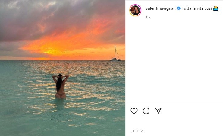 Girata di spalle mette le mani tra i capelli e ammira il meraviglioso panorama, i suoi tantissimi e affezionati follower invece hanno occhi solo per lei, non riuscivano più a smettere di guardarla. Ai fan non è certo sfuggito un piccante dettaglio, di che si tratta? Valentina Vignali sta facendo il bagno in topless, lo slip del costume che indossa è striminzito e mette in bella mostra il suo fondoschiena mozzafiato. Sempre più seducente e incantevole anche questa volta ha lasciato tutti senza parole, è proprio uno schianto.