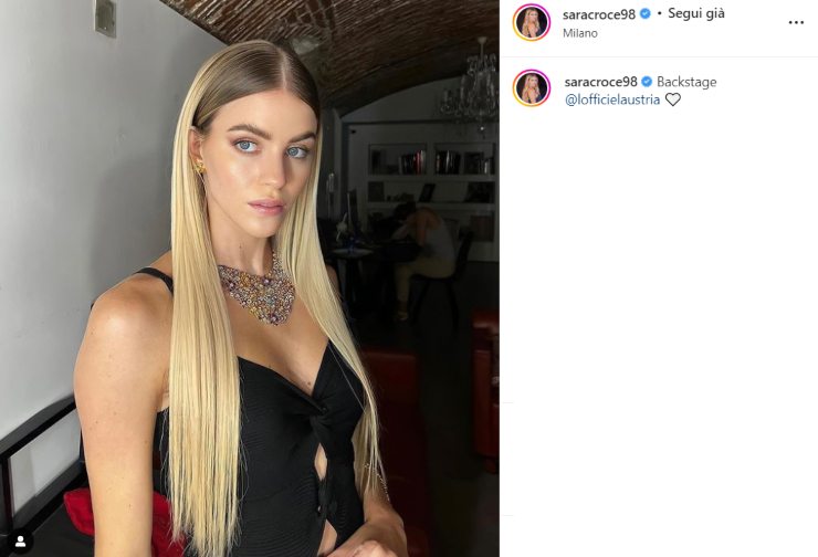 Sara Croce più bella che mai regala sui social un primo piano da infarto, la modella è incantevole in abito nero mentre l’occhio cade nella scollatura.