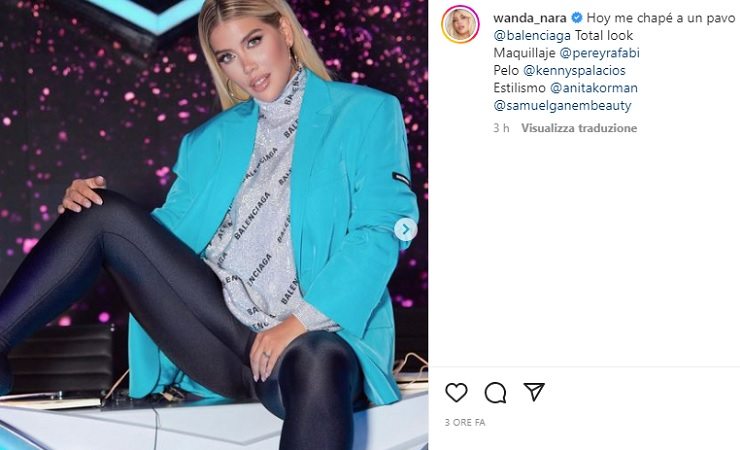 Seduta sul bancone si mette in posa e guarda la fotocamera con un’espressione davvero seducente e ammaliante che ha steso tutti coloro che la seguono e la amano. Wanda Nara sotto la giacca indossa leggings super attillati che segnano perfettamente le sue magnifiche forme, le sue gambe sono stupende.