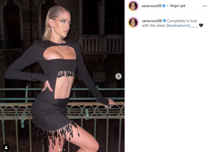 Nelle ultime ore, invece, l’ex Bonas di Avanti un Altro ha stupito ancora una volta con un mini-abito molto particolare. Nelle foto frutto di una collaborazione col brand, la Croce sfoggia un vestito nero dal modello tubino aderente, ma con ampissimi intagli che lasciano completamente scoperto addome e petto. L’occhio cade volontariamente sul decolleté di Sara, messo in evidenza dalla particolare apertura, ma anche sulle gambe perfette e abbronzate, che spuntano fuori in una posa plastica. Per l’occasione la showgirl mostra un make-up forte e intenso, con capelli effetto bagnato sul viso.