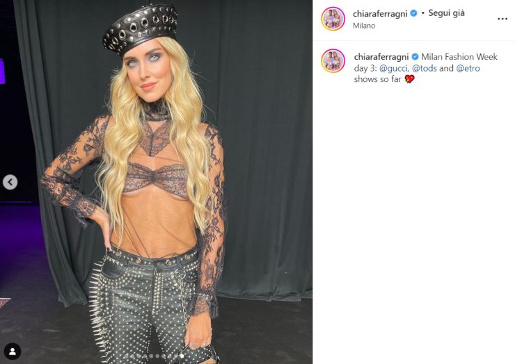 Chiara Ferragni condivide su Instagram una raccolta dei suoi look alla Milano Fashion Week: durante il terzo giorno ha sfoggiato un outfit di Gucci che lascia poco all’immaginazione, praticamente senza veli.
