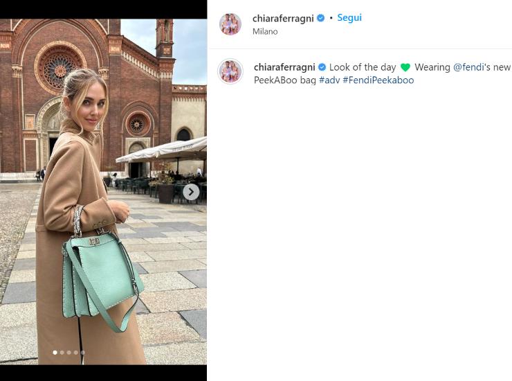 Nell’ultimo post pubblicato sulla sua pagina Chiara ha sfoggiato uno dei classici di Fendi, la borsa PeekABoo. “Look del giorno” ha scritto la Ferragni. “Indosso la nuova borsa Fendi PeekABoo” si legge nella didascalia. Per l’occasione Chiara ha posato di fronte ad uno dei luoghi storici di Milano, la chiesa di Santa Maria del Carmine.