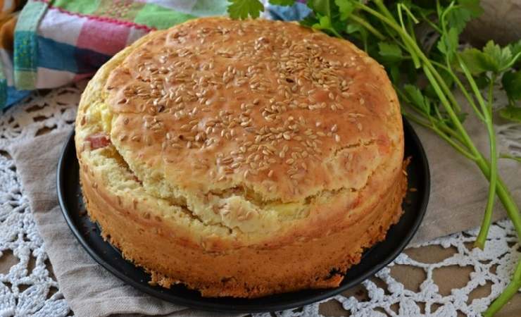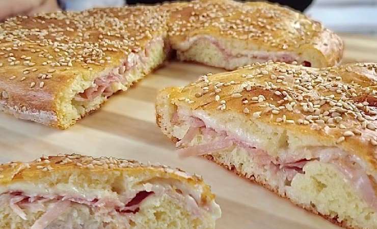Versate ora metà dell’impasto all’interno di uno stampo del diametro di 24 cm precedentemente oliato, adagiate le fette di formaggio e prosciutto e coprite il ripieno con la restante parte di impasto. Decorate la superficie con i semi di sesamo e cuocete in forno preriscaldato a 180 gradi per 25 minuti circa.