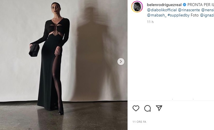 Nel post pubblicato ieri sera la splendida conduttrice e showgirl è vestita tutta di nero ed è davvero uno schianto. Il lungo abito che indossa è molto attillato e segna perfettamente le sue fantastiche forme. La scollatura è generosa e mette in evidenza il suo ‘davanzale’ da paura, sotto invece lo spacco è profondissimo, arriva proprio fin lì e rischia di mostrare fin troppo.