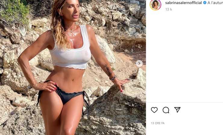 Corpo stupendo e sensualità da vendere, nella prima foto Sabrina Salerno si mette in posa tra gli scogli e guarda altrove con un’espressione ammaliante e travolgente, i suoi seguaci invece hanno occhi solo per lei. Questi non hanno potuto fare a meno di ammirare le sue fantastiche forme e riempirla di apprezzamenti e like. Il pezzo di sopra del costume mette in evidenza il suo esplosivo décolleté e un particolare hot non è passato inosservato agli occhi dei fan. Quale? La parte superiore del bikini è bianca ed è un po’ trasparente, si intravedono infatti i capezzoli, un piccante dettaglio che ha infuocato non poco il web.
