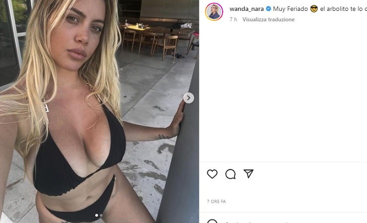 Il costume che indossa è davvero striminzito, lo slip è sgambatissimo e sopra non riesce a contenere del tutto il suo décolleté esplosivo. Parte delle sue favolose ‘bocce’ infatti escono fuori, un piccante dettaglio che ha infiammato non poco il web. Wanda Nara è davvero fantastica e super sensuale, anche questa volta ha fatto il boom di complimenti e like, i fan la venerano.